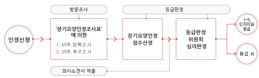- 본인 직접 신청 : 본인 신분증, 장기요양인정신청서 작성, 필요시 의사소견서 제출